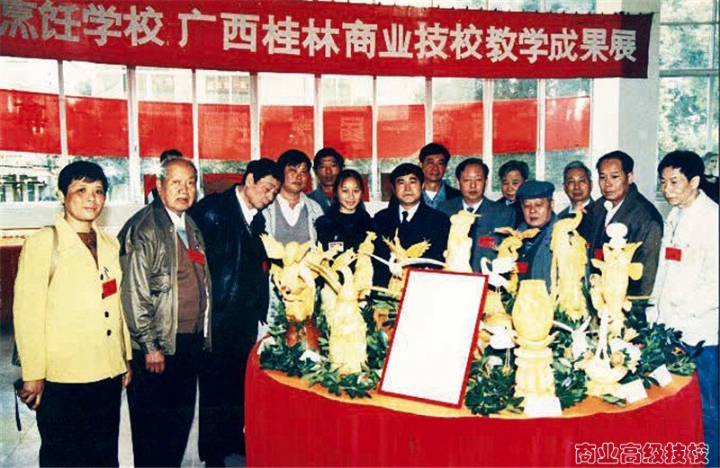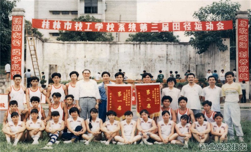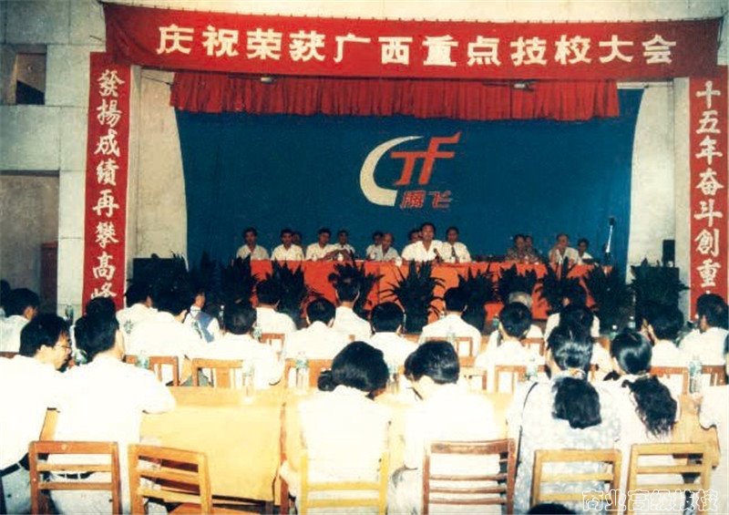广西桂林商业技工学校晋升为广西重点技校,全校召开庆祝大会,鼓舞师生们在新的起点携手共进